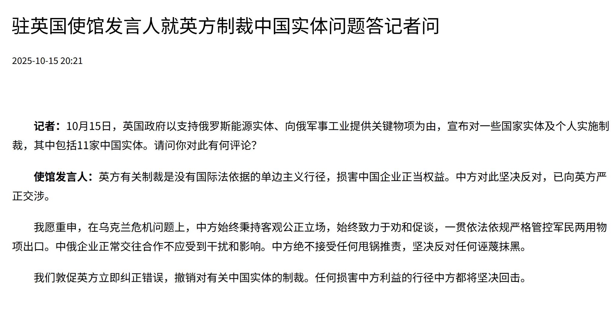 使馆发言人:英方有关制裁是没有国际法依据的单边主义行径,损害中国企业正当权益。中方对此坚决反对,已向英方严正交涉。