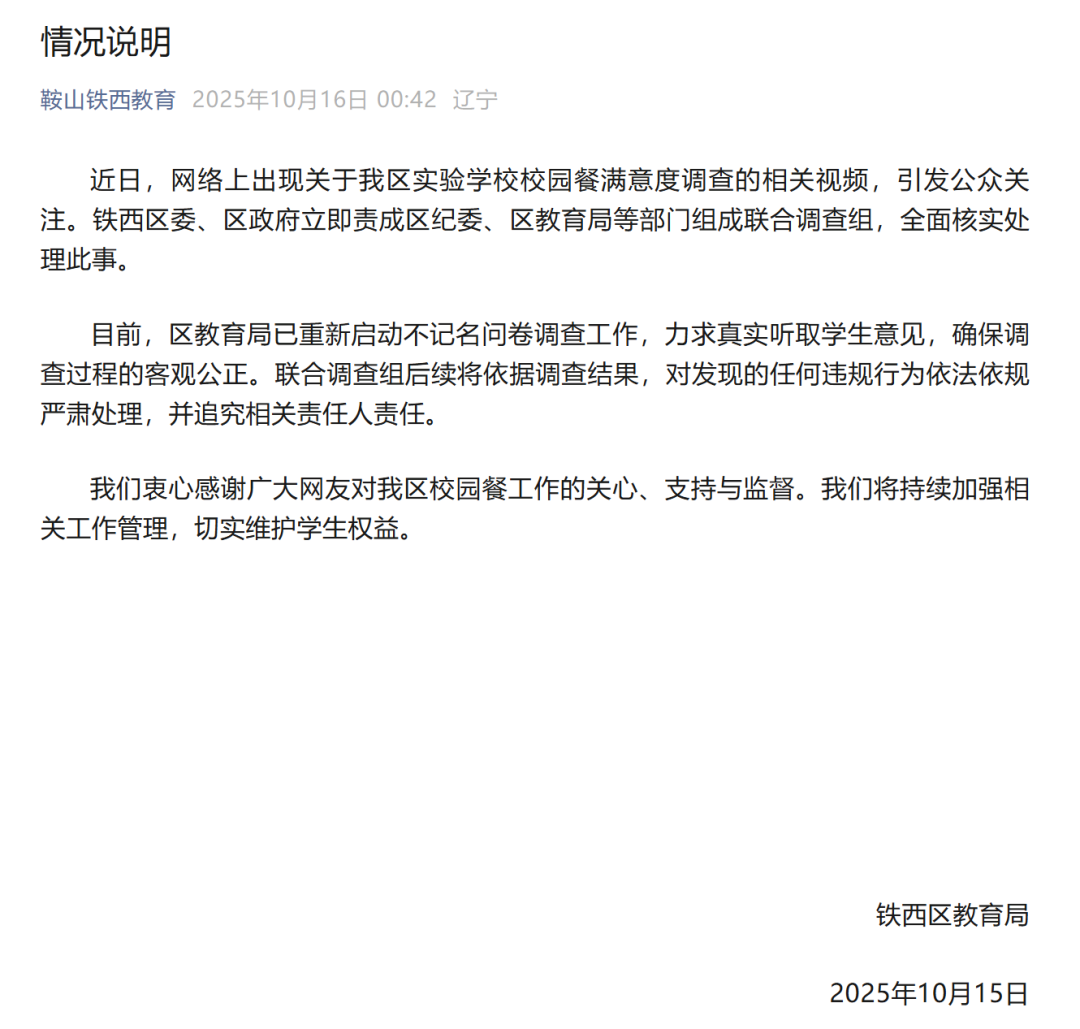 近日,网络上出现关于我区实验学校校园餐满意度调查的相关视频,引发公众关注。铁西区委、区政府立即责成区纪委、区教育局等部门组成联合调查组,全面核实处理此事。