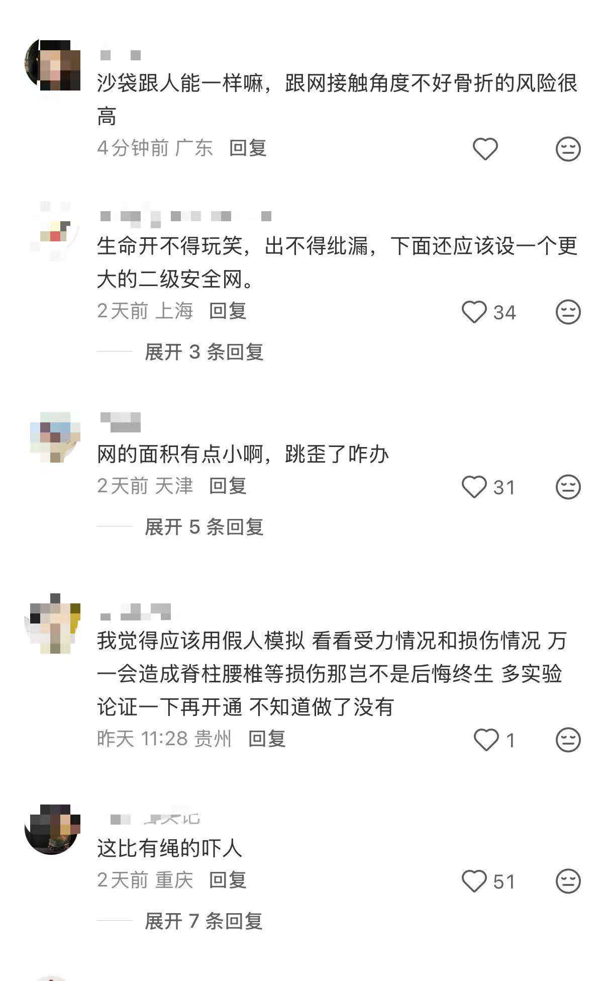 对此,网友们纷纷留言热议:“这比有绳蹦极吓人多了!”“生命安全绝不能开玩笑,半点纰漏都出不得,下方或许该增设一层更大的二级安全网才更稳妥”“这看着和跳楼有啥区别?”……不少网友直言对此安全性存疑,尤其认为仅通过沙袋模拟测试的方式不够严谨,难以全面复刻人体参与时的真实场景与风险点。
