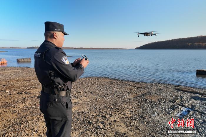 黑龙江出入境边防检查总站双鸭山边境管理支队民警用无人机巡视乌苏里江,为渔民护航。于哲浩 摄