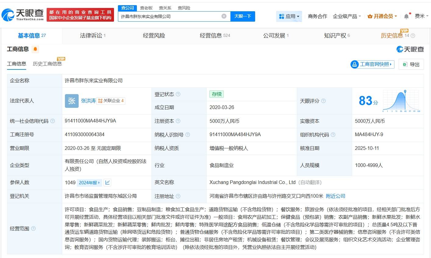 根据天眼查App显示,近日,许昌市胖东来实业有限公司发生工商变更,经营范围新增旅游业务、会议及展览服务、组织文化艺术交流活动等。该公司成立于2020年3月,法定代表人为张洪涛,注册资本5000万人民币,由许昌市胖东来超市有限公司全资持股,后者由许昌市胖东来商贸集团有限公司持股约63%。