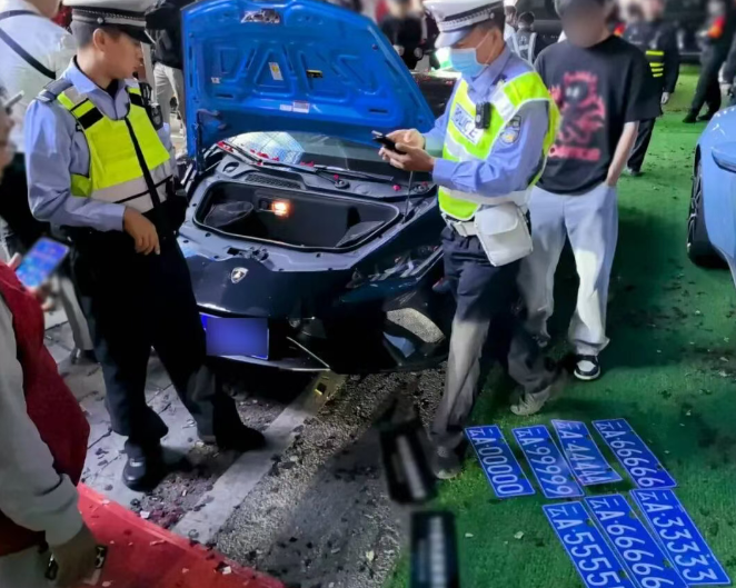 近日,昆明市公安局交管支队三大队接到群众举报线索,称一酒吧门口停放多辆豪华跑车,部分车辆悬挂“云A•00000”“云A•33333”“云A•44444”“云A•55555”“云A66666”“云A•77777”“云A•99999”等“豹子号”车牌疑似伪造车牌。接到报警后,民警立即开展核查处置并在现场迅速锁定目标车辆,发现一辆“兰博基尼”和一辆“阿斯顿马丁”跑车上均悬挂了举报中提及的“豹子号”车牌。