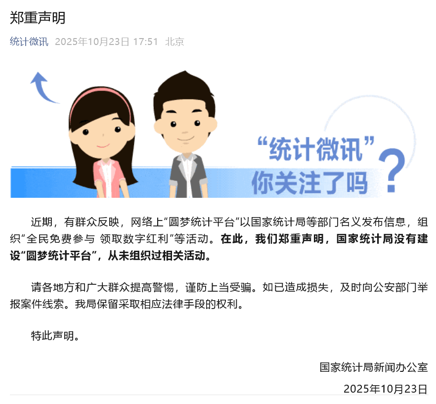 10月23日,国家统计局新闻办公室发布郑重声明: