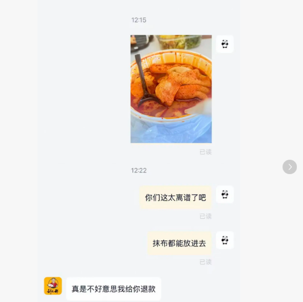 该网友称,中午点了麻辣烫,和同事一起吃,同事说麻辣烫好香,夹了块鸡蛋干吃。另一位同事也夹了一块藕,随后,同事捞出了抹布问这是啥?“我说应该是毛肚,她看咋这么大就放下了,我喝了汤吃了几块又捞出抹布,看到了线头才反应出是一整块抹布,所有人瞬间食欲全无!”该网友称,自己当即拍下图片并发给店家,称这也太离谱了,连抹布都能放进去。从网友发布的与商家聊天对话截图可见,店家曾称“把东西(抹布)留出来,我们过去取一下,看看是不是店里的”。店家还表示,从来没有出现过这种情况,因为店里多数都是自家人。