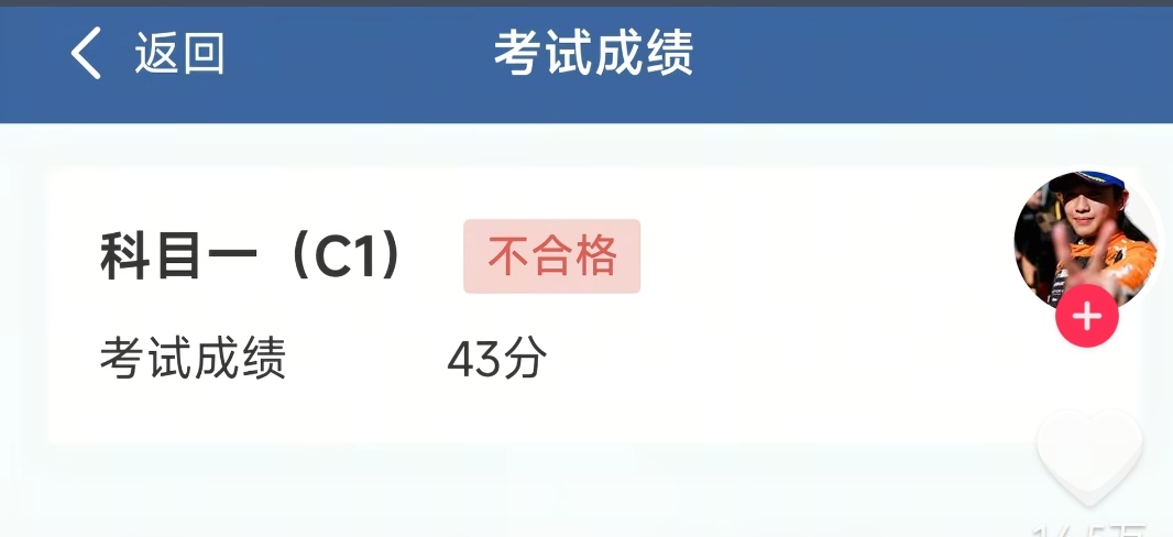 扬子晚报网10月31日讯(记者 郭一鹏) 近日,抖音上认证为赛车手刘东翰在网上“自晒”驾考成绩单,称参加两次科目一考试均不合格。这顿时引发了网友热议,有人直接调侃,“文科难倒武状元”。