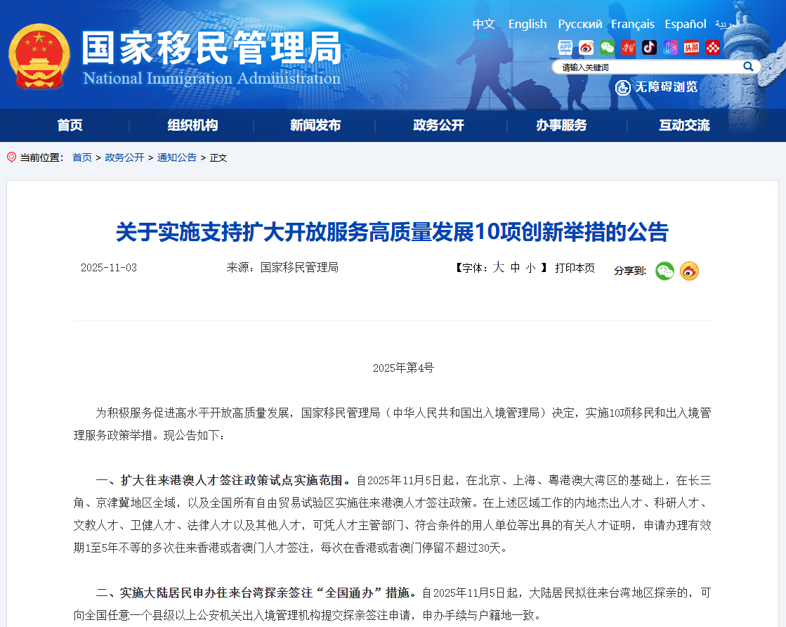 事关港澳台人员往来、过境免签口岸扩容等 10项重磅政策发布 详情