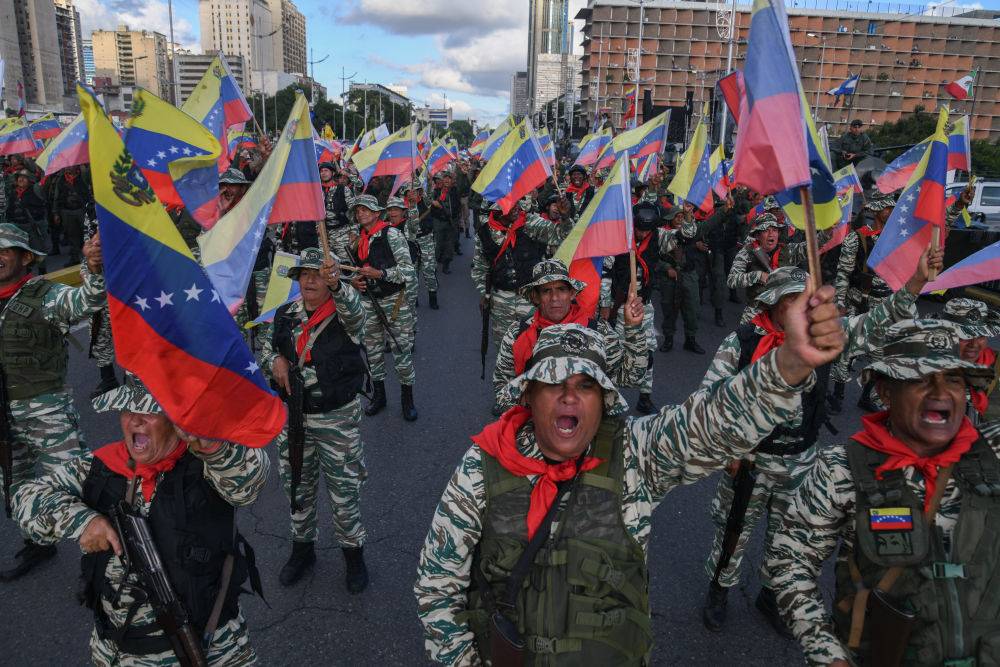 9月23日,在委内瑞拉首都加拉加斯,民兵组织成员挥舞委内瑞拉国旗参加游行,反对美国在加勒比海域的军事威胁。新华社发(马科斯·萨尔加多摄)