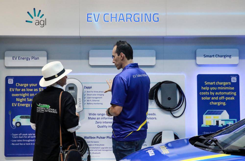 3月7日,在澳大利亚悉尼举行的家庭能源与电动车展上,工作人员为参观者介绍电动汽车充电设备。新华社记者马平摄