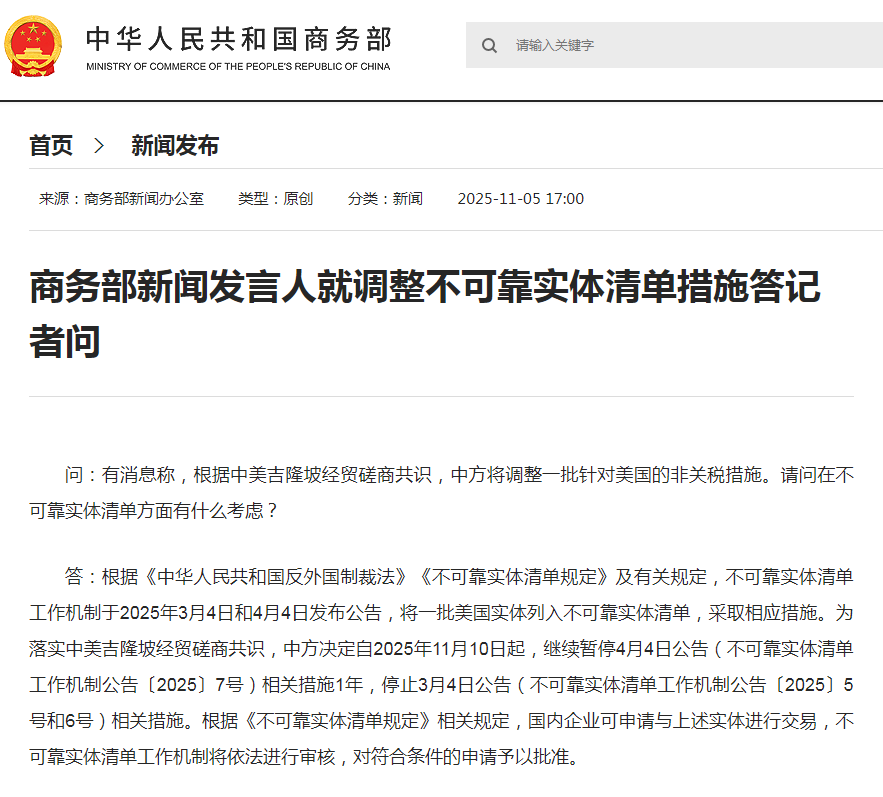 答:根据《中华人民共和国反外国制裁法》《不可靠实体清单规定》及有关规定,不可靠实体清单工作机制于2025年3月4日和4月4日发布公告,将一批美国实体列入不可靠实体清单,采取相应措施。为落实中美吉隆坡经贸磋商共识,中方决定自2025年11月10日起,继续暂停4月4日公告(不可靠实体清单工作机制公告〔2025〕7号)相关措施1年,停止3月4日公告(不可靠实体清单工作机制公告〔2025〕5号和6号)相关措施。根据《不可靠实体清单规定》相关规定,国内企业可申请与上述实体进行交易,不可靠实体清单工作机制将依法进行审核,对符合条件的申请予以批准。