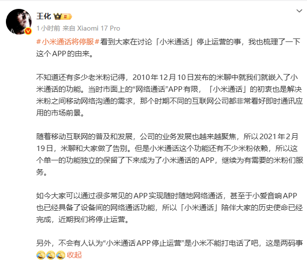 11月6日,小米集团公关部总经理王化在微博发文回应“小米通话将停服”一事: