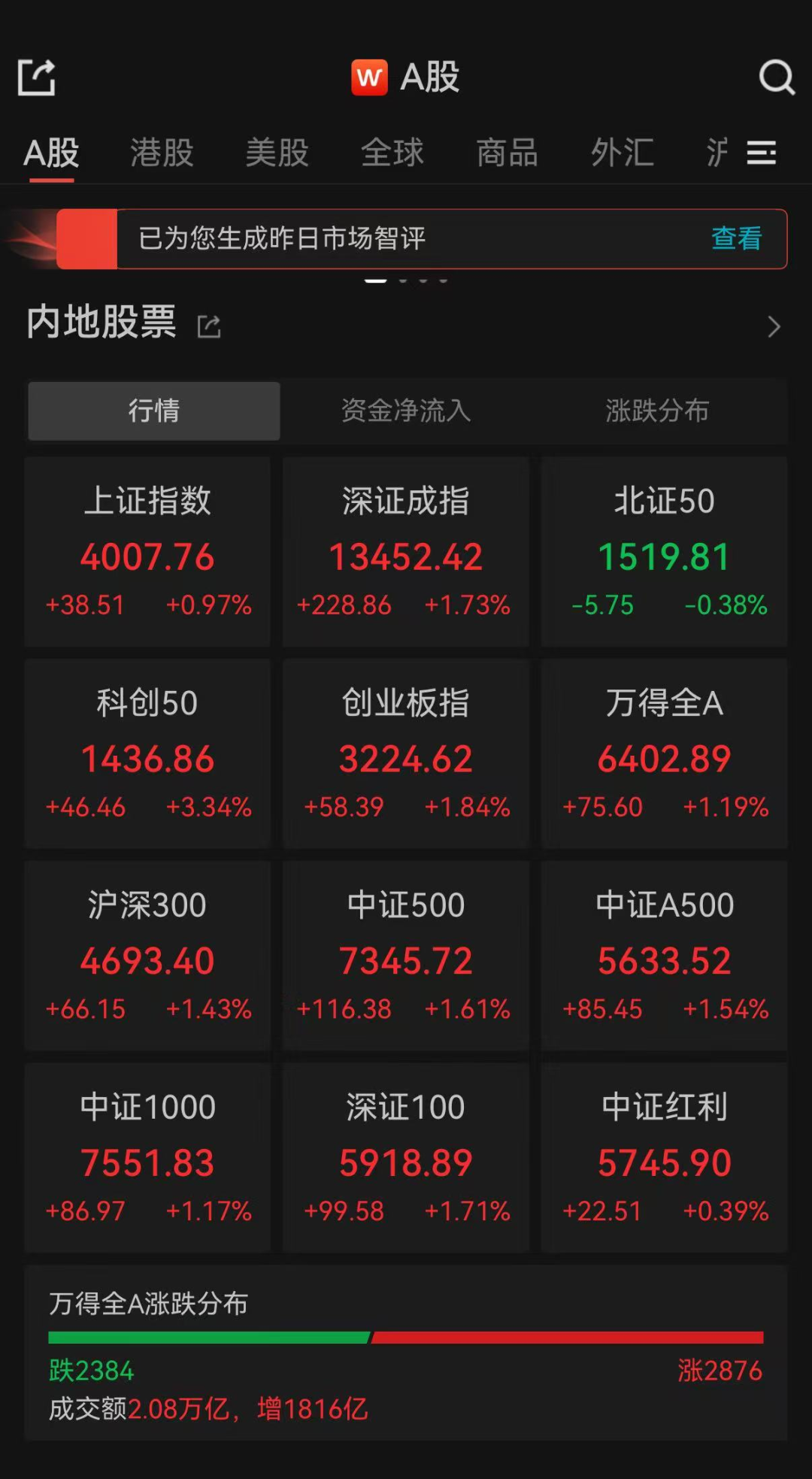 6日,A股三大指数集体高开,全天震荡上行,沪指再次站上4000点。截至收盘,上证指数涨0.97%,报4007.76点,深证成指涨1.73%,创业板指涨1.84%。全天成交2.08万亿元,全市超2800只个股上涨。