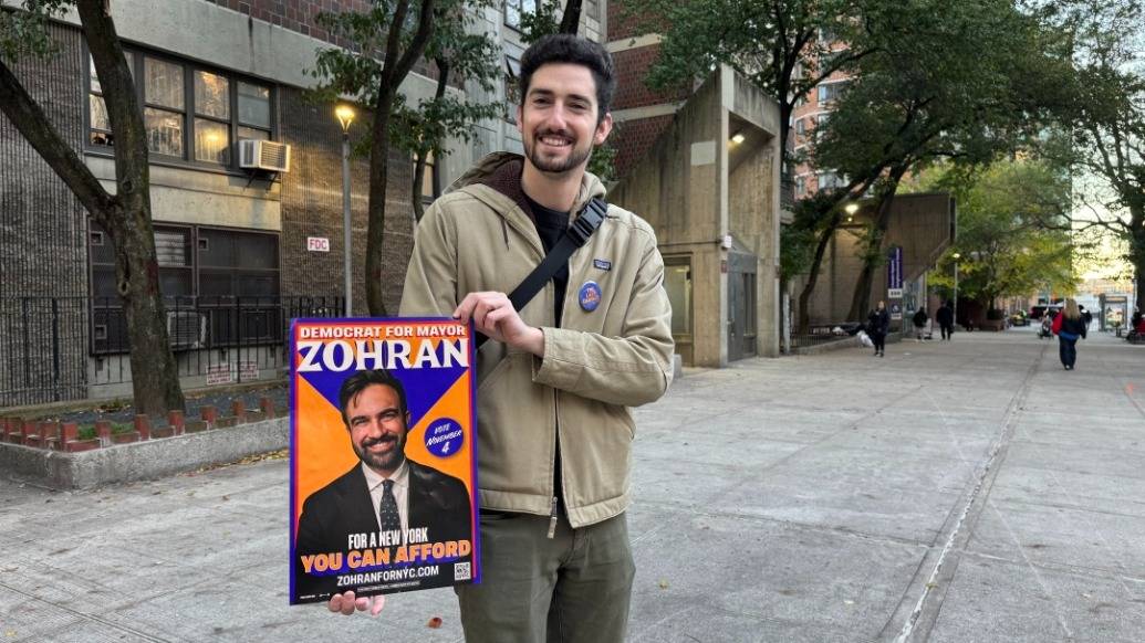 11月4日,支持者在美国纽约一个投票站外展示候选人祖赫兰·马姆达尼的竞选海报(手机拍摄)。新华社 图