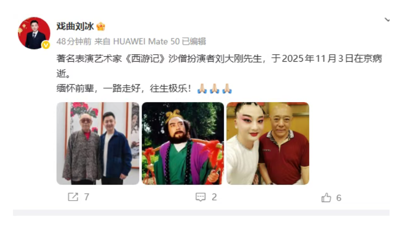 据戏曲演员刘冰11月7日发文:著名表演艺术家《西游记》沙僧扮演者刘大刚先生,于2025年11月3日在京病逝。
