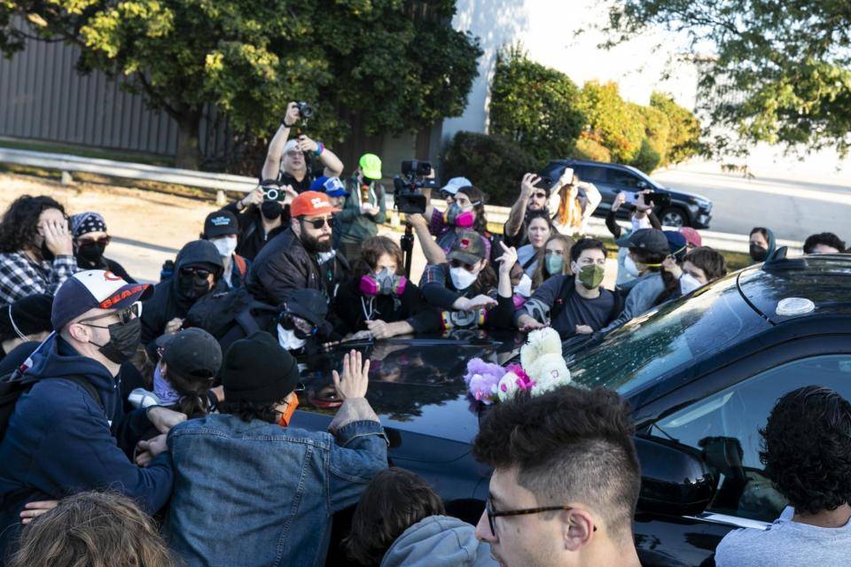 9月26日,在位于美国芝加哥西郊布罗德维尤市,抗议者阻止移民与海关执法局的车辆驶入办公机构。新华社发(文森特·约翰逊摄)