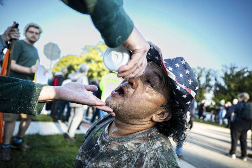 9月26日,在位于美国芝加哥西郊布罗德维尤市的移民与海关执法局办事机构外,执法人员发射的催泪弹伤及一名抗议者,同伴在为他进行紧急处置。新华社发(文森特·约翰逊摄)