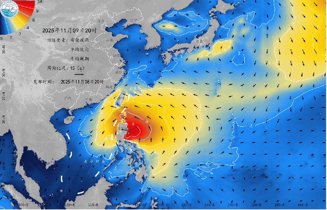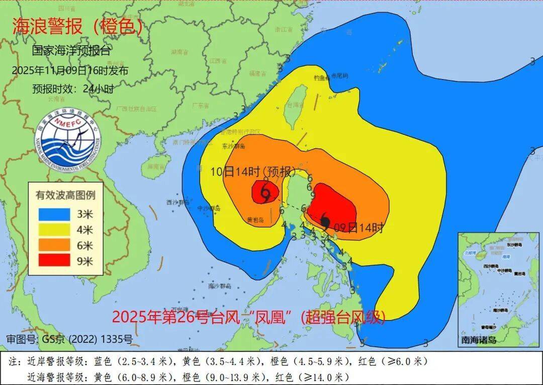 巴士海峡、南海北部、中部将出现6到10米的狂浪到狂涛区,台湾海峡、台湾以东洋面将出现3到5米的大浪到巨浪区,近海海域海浪预警级别为橙色;