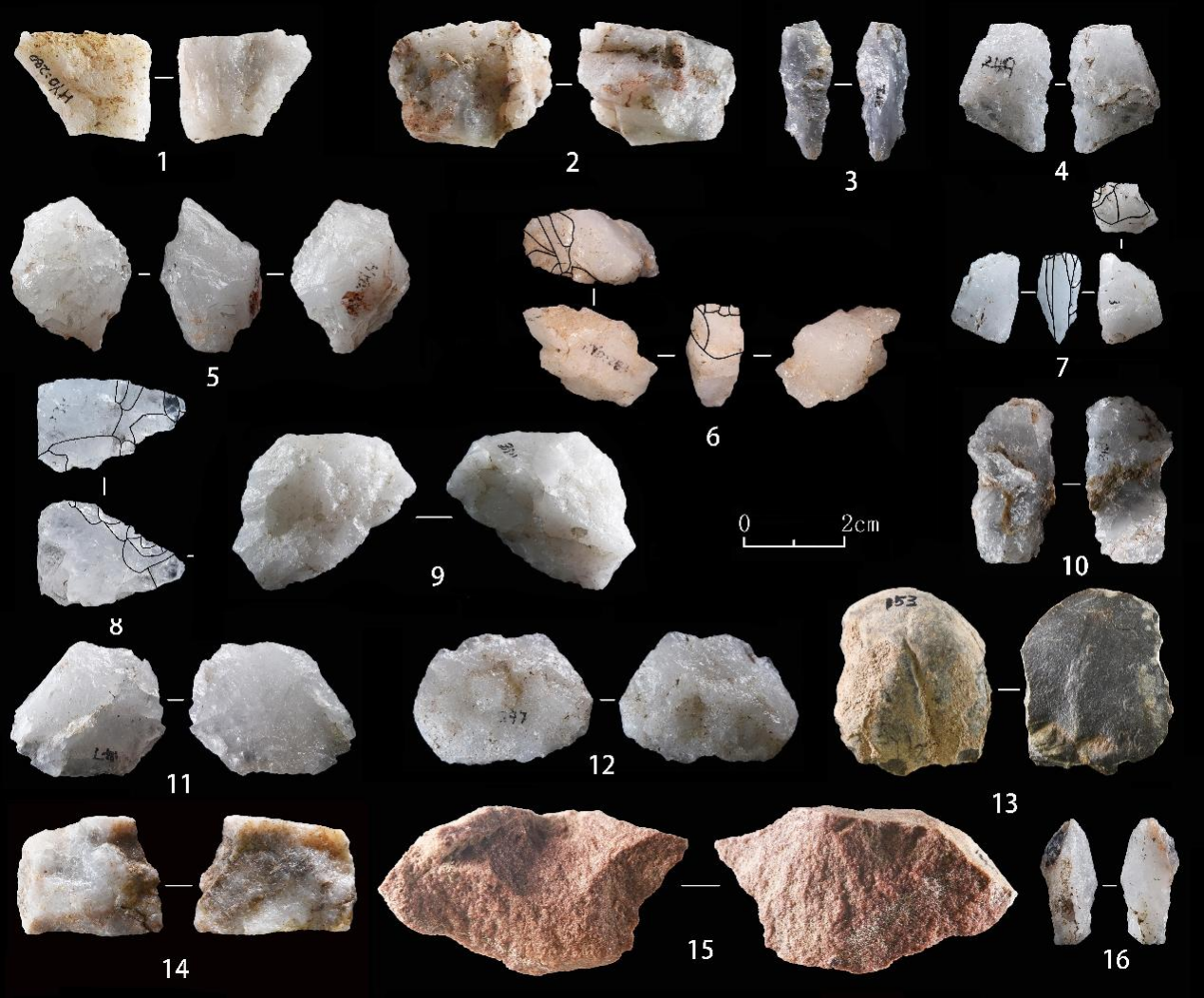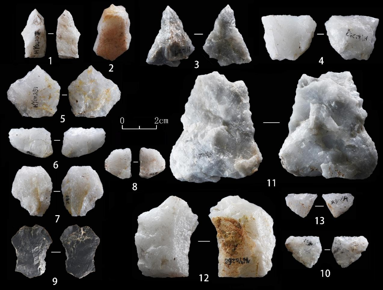 石核原料均为脉石英,毛坯多为带有节理面的自然断块。砸击剥片和锤击剥片并重。砸击剥片过程中,不断旋转核体,对石核进行强化利用,多台面以及枣核形砸击石核的存在也表明了这一点。砸击法的大量利用在一定程度上改善了因脉石英节理发育对剥片的影响,体现了古人类因地制宜、因材施策的剥片策略。工具多采用片状毛坯,硬锤直接修理,以刃缘为中心。加工修理较为简单,呈现出较强的权宜性。整体来看,虎窑洞遗址的石器工业为北方地区传统的石核—石片技术。