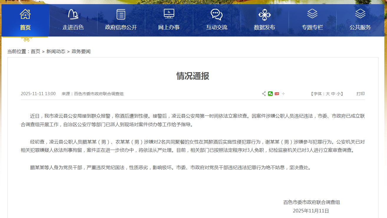 经初查,凌云县公职人员腊某某(男)、农某某(男)涉嫌对2名共同聚餐的女性在其醉酒后实施性侵犯罪行为,谢某某(男)涉嫌参与犯罪行为。公安机关已对相关犯罪嫌疑人依法刑事拘留,案件正在进一步侦办中,将依法从严处理。目前,相关部门已按照法定程序对3人免职,纪检监察机关已对3人进行立案审查调查。