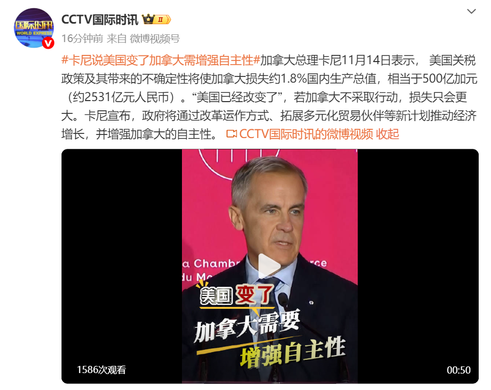 加拿大总理卡尼11月14日表示, 美国关税政策及其带来的不确定性将使加拿大损失约1.8%国内生产总值,相当于500亿加元(约2531亿元人民币)。“美国已经改变了”,若加拿大不采取行动,损失只会更大。卡尼宣布,政府将通过改革运作方式、拓展多元化贸易伙伴等新计划推动经济增长,并增强加拿大的自主性。