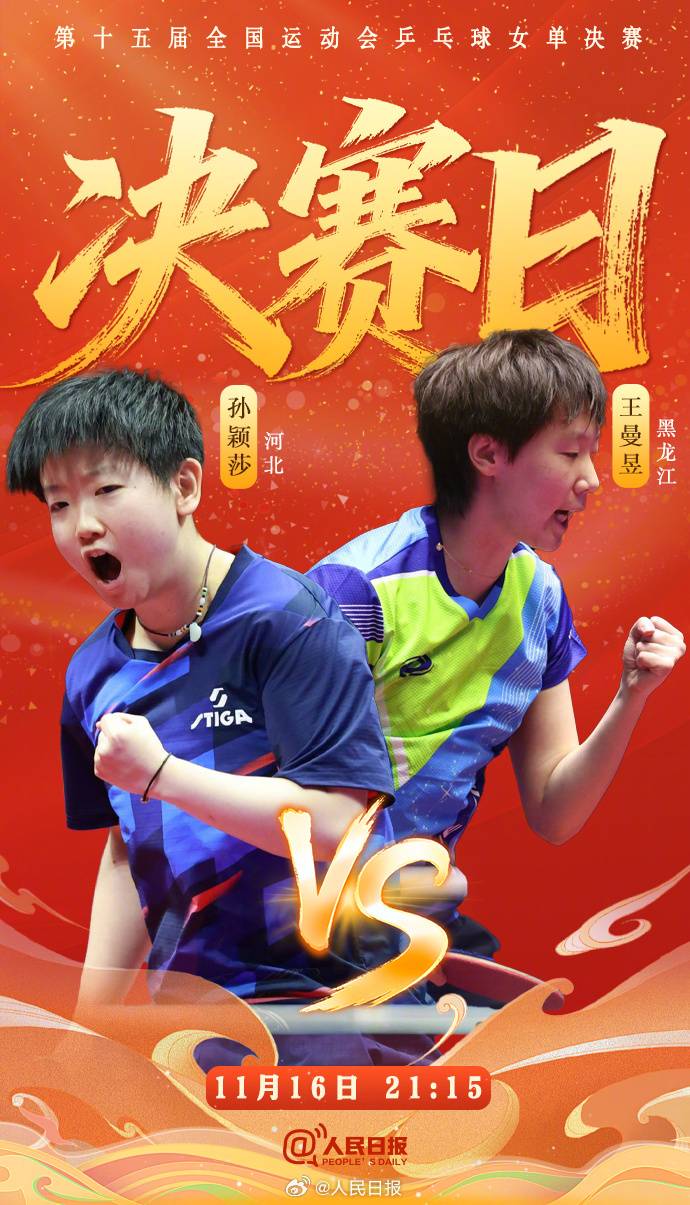 11月16日,第十五届全国运动会乒乓球决赛将进行,为运动员们加油!