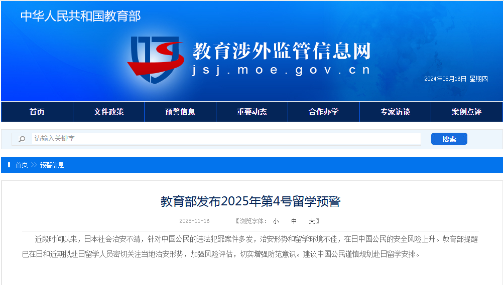 教育部发布留学预警:中国公民谨慎规划赴日留学安排 详情