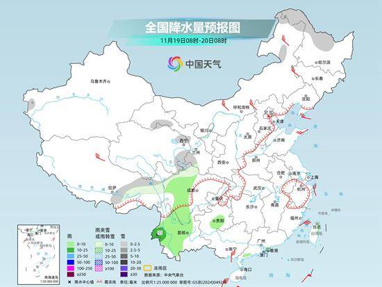 昨天,随着寒潮南下,干冷气团向南推进,长江沿线降水停歇,雨雪天气主要集中在西南到华南一带,云南、广西部分地区雨势较强。监测显示,18日8时至19日6时,青海南部、西藏东部、云南东北部、四川甘孜东部、黑龙江东部等地部分地区出现小雪或雨夹雪;重庆南部、云南中南部、广西中南部及台湾岛北部出现中到大雨,局地暴雨,台湾岛北部局地大暴雨。