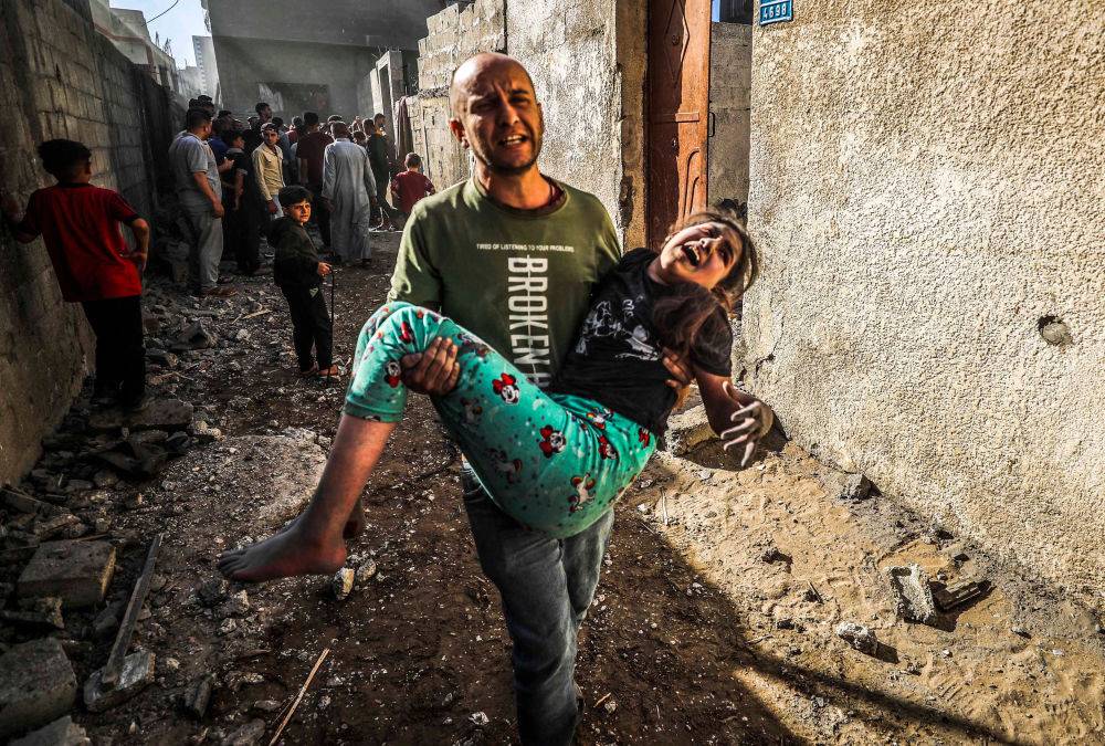 2025年5月21日,在以军空袭加沙地带北部杰巴利耶难民营所在区域后,一名男子抱着受伤的女孩寻求救援。新华社发(马哈茂德·扎基摄)