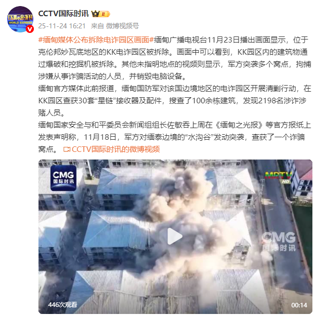 缅甸广播电视台11月23日播出画面显示,位于克伦邦妙瓦底地区的KK电诈园区被拆除。画面中可以看到,KK园区内的建筑物通过爆破和挖掘机被拆除。其他未指明地点的视频则显示,军方突袭多个窝点,拘捕涉嫌从事诈骗活动的人员,并销毁电脑设备。