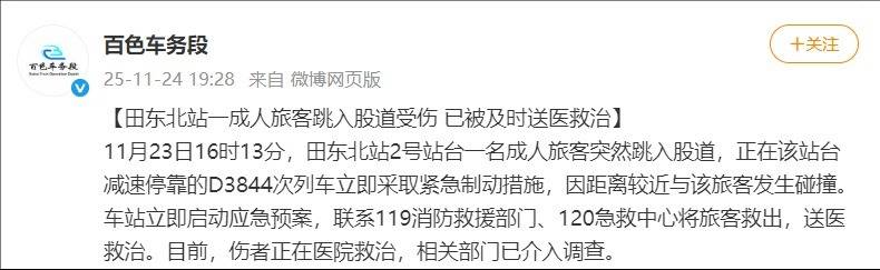 11月23日16时13分,田东北站2号站台一名成人旅客突然跳入股道,正在该站台减速停靠的D3844次列车立即采取紧急制动措施,因距离较近与该旅客发生碰撞。车站立即启动应急预案,联系119消防救援部门、120急救中心将旅客救出,送医救治。目前,伤者正在医院救治,相关部门已介入调查。