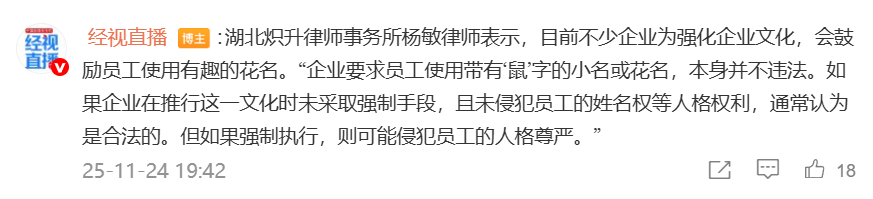 湖北炽升律师事务所杨敏律师表示,目前不少企业为强化企业文化,会鼓励员工使用有趣的花名。“企业要求员工使用带有‘鼠’字的小名或花名,本身并不违法。如果企业在推行这一文化时未采取强制手段,且未侵犯员工的姓名权等人格权利,通常认为是合法的。但如果强制执行,则可能侵犯员工的人格尊严。”