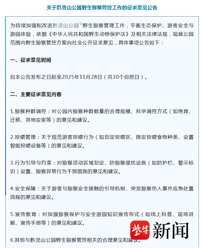 扬子晚报/紫牛新闻记者也注意到,就在10月29日,黔灵山公园管理处和云岩区自然资源局专门发布了“关于黔灵山公园野生猕猴管控工作的征求意见公告”,共设有猕猴种群调控、投喂管理、行为引导与约束、安全保障、宣传教育以及其他与黔灵山公园野生猕猴管控相关的合理意见和建议。像投喂管理,涉及到关于规范游客投喂行为(如划定投喂区、限定投喂食物种类、设置智能投喂设备等)的意见和建议;行为引导与约束,则是对猕猴活动区域划定、防猕猴侵扰设施(如防护栏、警示标识)设置、猕猴异常行为干预措施的意见和建议。安全保障这一项则是关于游客与猕猴安全接触的引导机制、突发猕猴伤人事件应急处置流程的意见和建议。