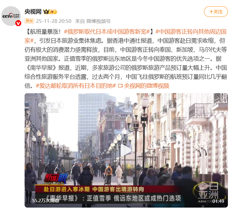 航班量暴涨!俄罗斯取代日本成中国游客新宠
