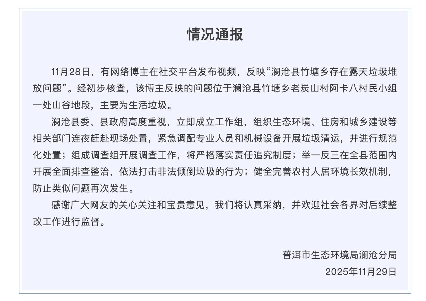11月28日,有网络博主在社交平台发布视频,反映“澜沧县竹塘乡露天垃圾堆放问题”。云南省普洱市生态环境局澜沧分局11月29日发布情况通报称,当地已紧急开展处置,涉事区域位于普洱市澜沧县竹塘乡老炭山村阿卡八村民小组一处山谷地段,主要为生活垃圾。