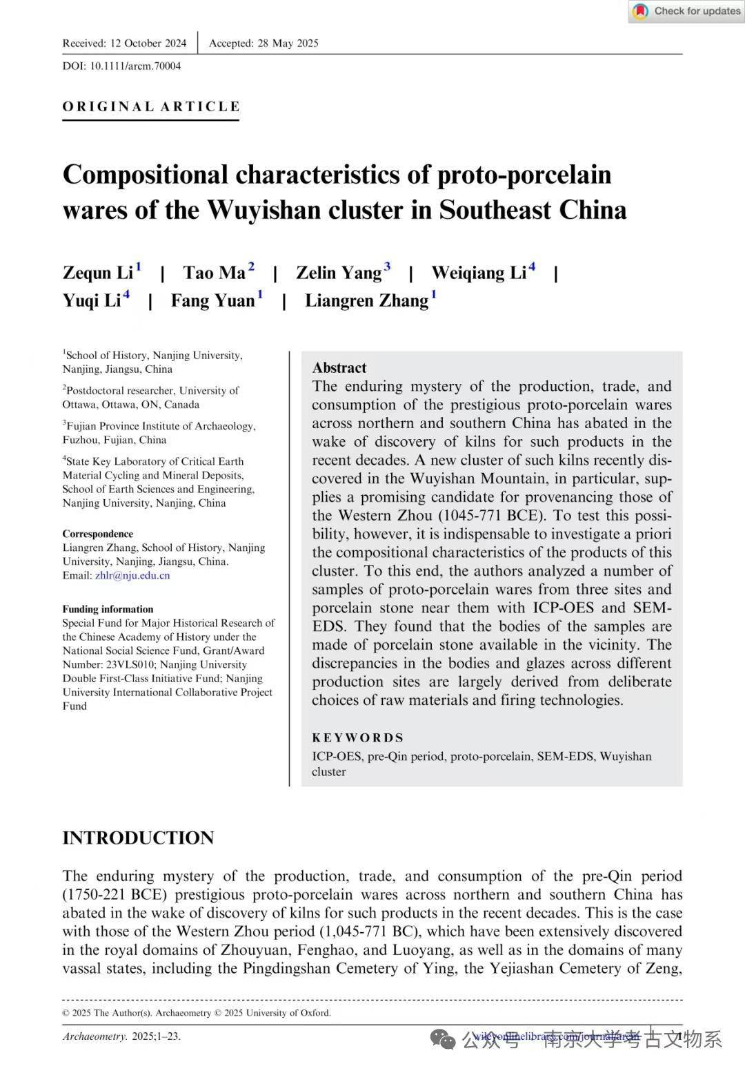 南京大学历史学院张良仁教授、李泽群博士团队发表在国际知名科技考古期刊《Archaeometry》的论文