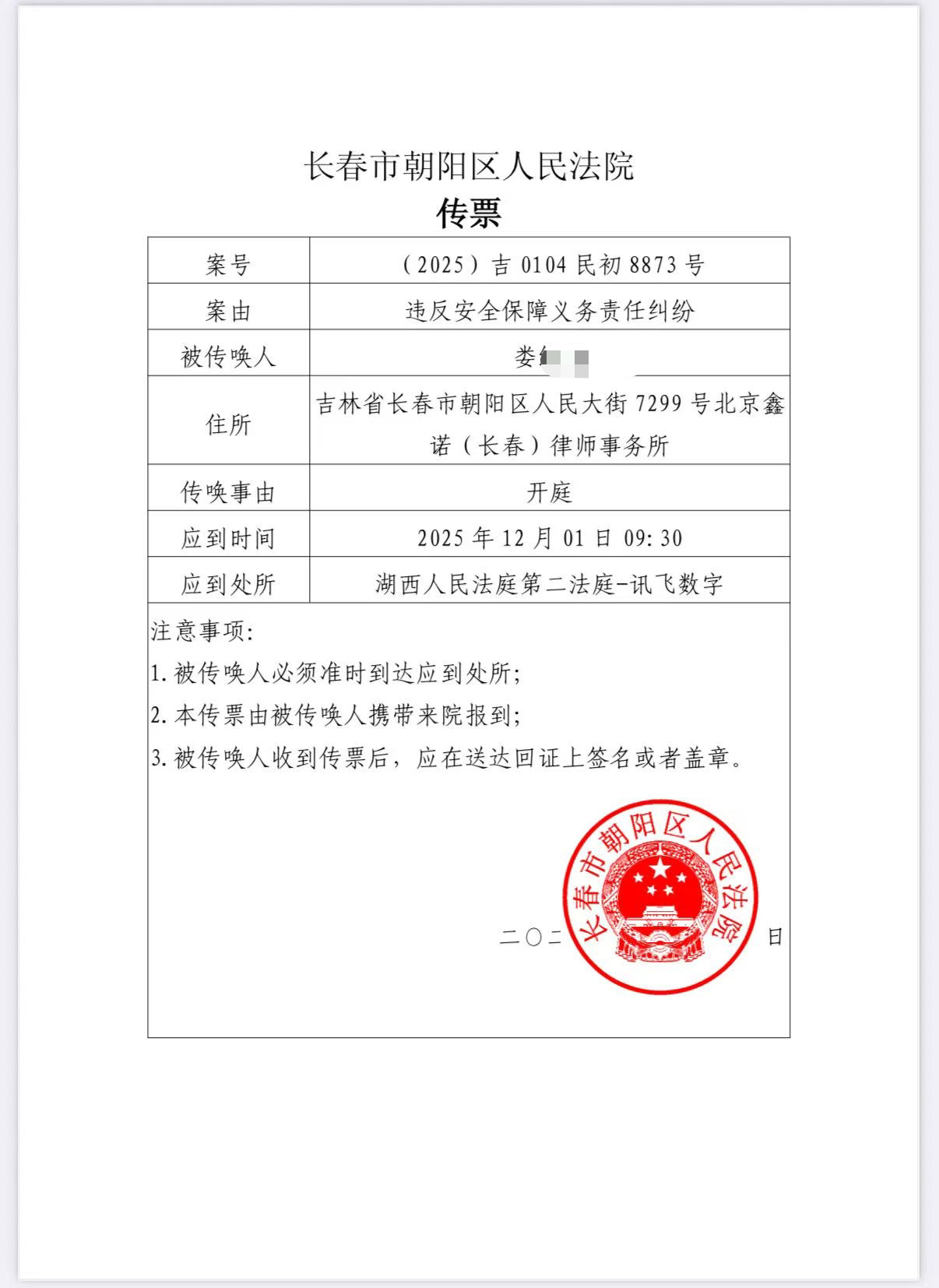 据娄女士提供的长春市朝阳区人民法院出具的传票显示,该案案由为违反安全保障义务责任纠纷,开庭时间为12月1日上午9时30分。