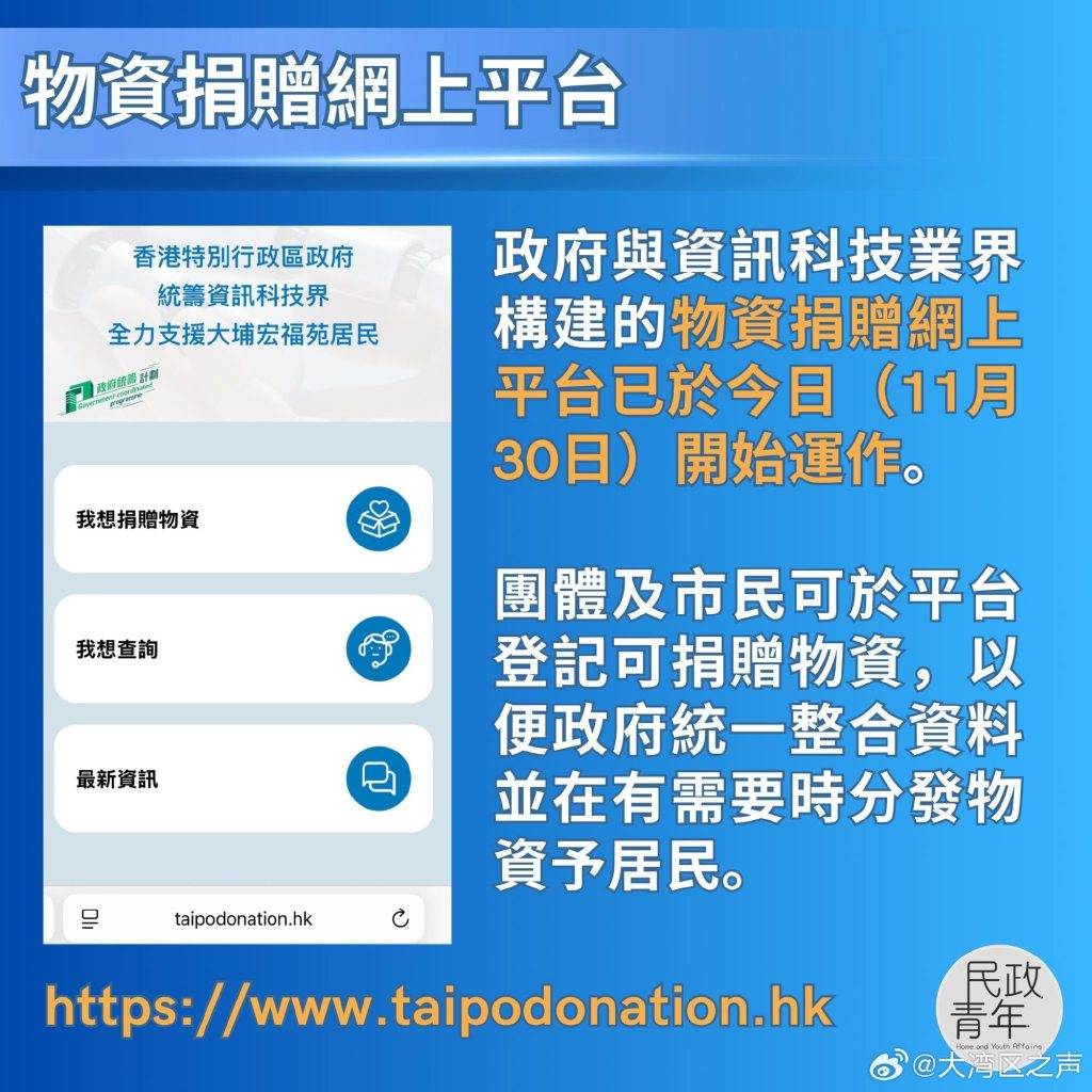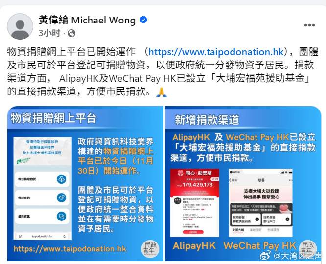 香港特区政府与资讯科技业界构建的物资捐赠网上平台已开始运作,团体及市民可于平台登记可捐赠物资,以便特区政府统一整合资料并在有需要时分发物资给有需要的居民。香港特区政府财政司副司长黄伟纶今日(12月1日)在社交平台呼吁团体及市民使用平台登记捐赠物资详情,以便特区政府统一分发物资给居民。