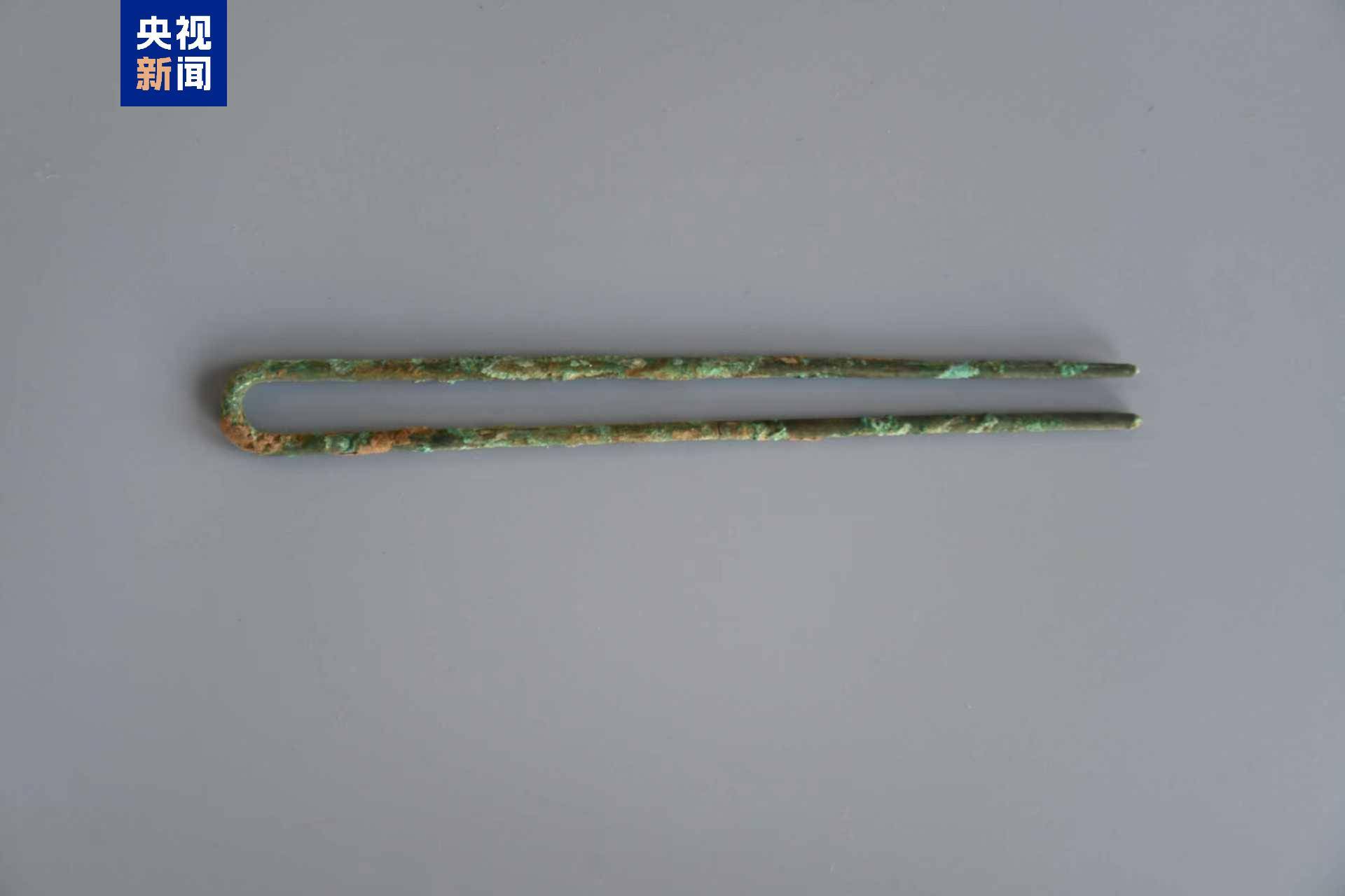 铜簪呈“U”形,由一根铜丝弯折而成,簪体的横截面为圆形。铜指环保存较好,部分有锈蚀,圆环状,横截面近圆形,素面。