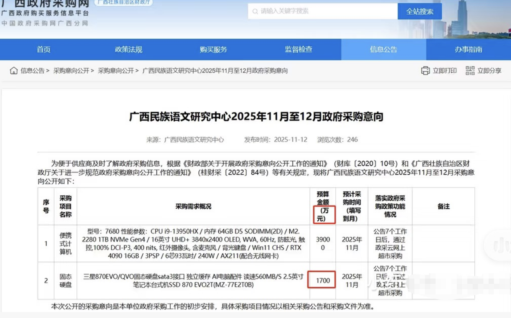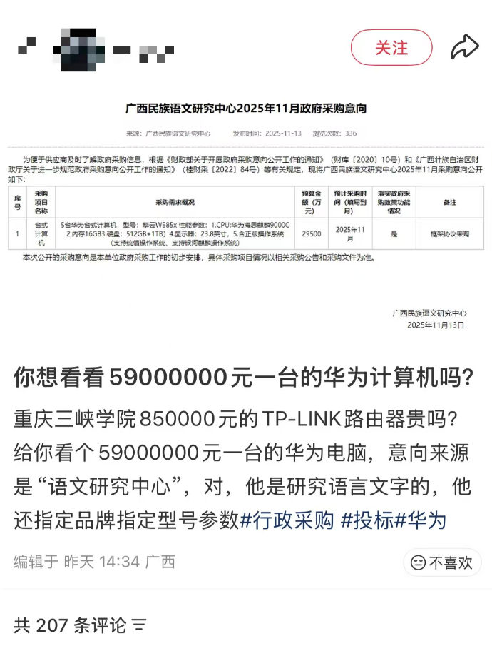 近日,有网友发帖称,广西民族语文研究中心11月12日、13日发布的政府采购意向公告中,涉及两次电脑及配件采购。在2则公告中,该中心需采购1台便携式计算机、1个固态硬盘及5台华为台式计算机,预算金额分别为39000万元、1700万元、29500万元,总价近7亿元,如此“天价”引发网友热议。12月2日,扬子晚报/紫牛新闻记者从广西民族语文研究中心工作人员了解到,属于正常采购,价格标错系细节问题,目前正在处理中。