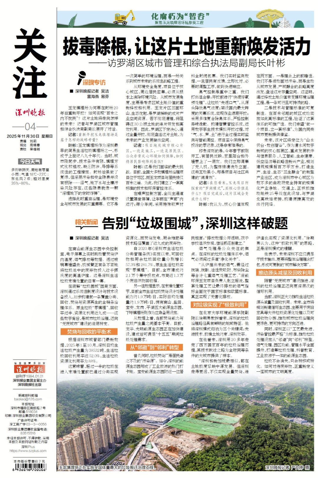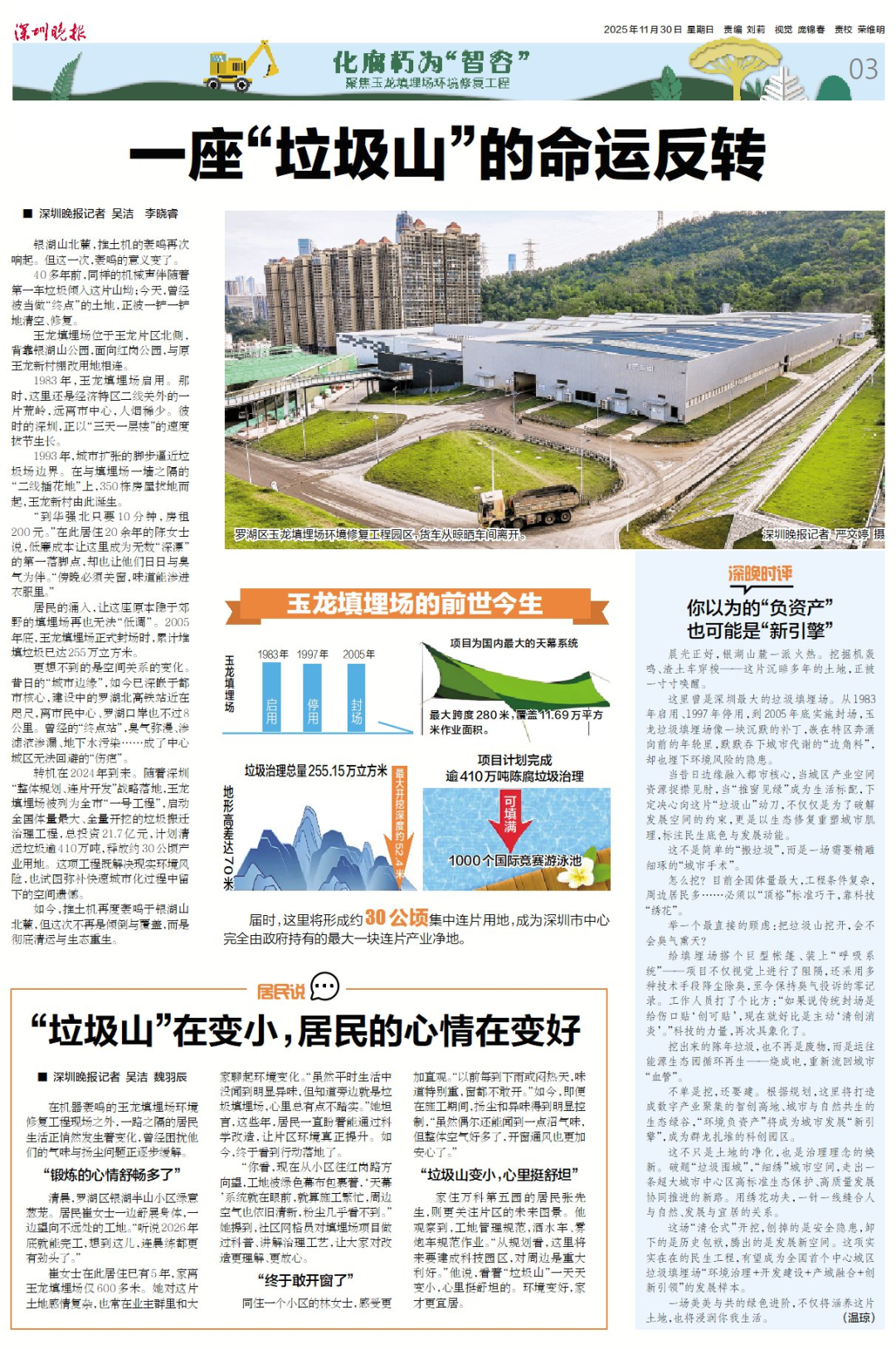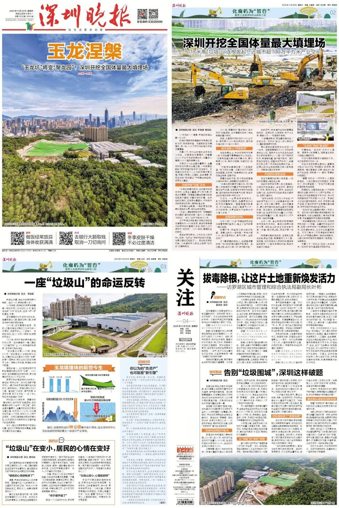 玉龙填埋场开挖,深圳晚报聚焦“玉龙涅槃”,推出专题报道《化腐朽为“智谷”——聚焦玉龙填埋场环境修复工程》。