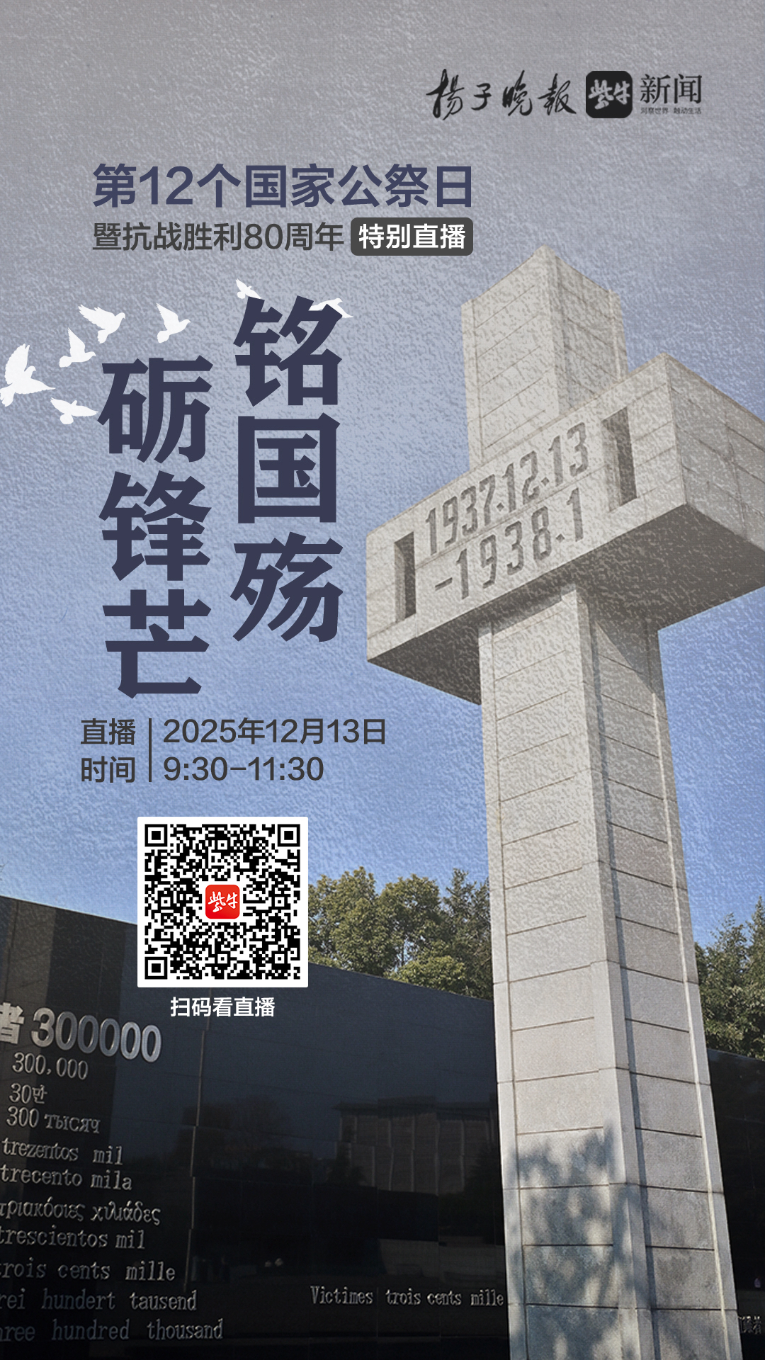 2025年12月13日是第十二个南京大屠杀死难者国家公祭日,2025年也是中国人民抗日战争暨世界反法西斯胜利80周年,在这个特别的时间节点上,扬子晚报紫牛新闻将于13日上午9:30起推出特别直播,多路记者全城联动,历史现场与演播室深度解读相结合,融合线上线下互动征集,呈现幸存者、后代与传承人的不灭证言,直面当下历史逆流的涌动,呼吁珍爱和平。同时直播庄重的国家公祭仪式还有紫牛新闻、扬子晚报视频号、抖音号、官方微博等平台。