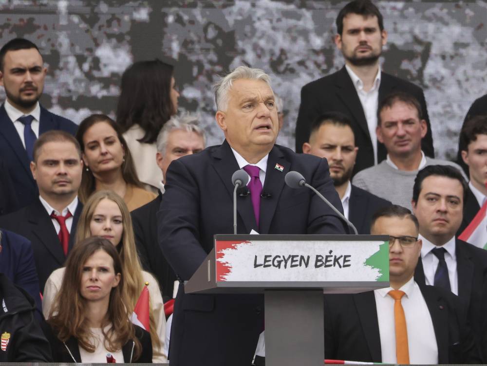 10月23日,匈牙利总理欧尔班在首都布达佩斯举行的一场集会上讲话。新华社发(弗尔季·奥蒂洛摄)