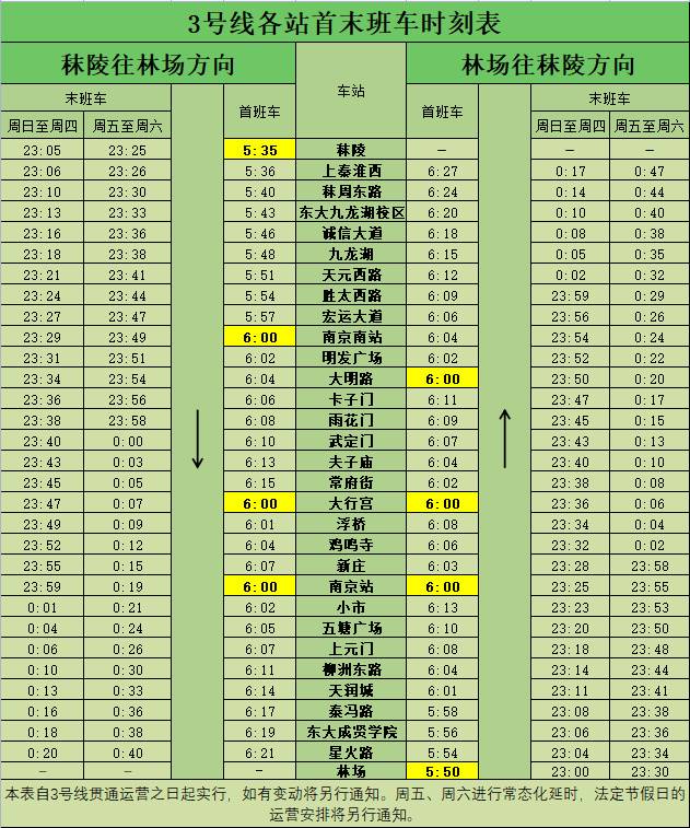 3号线全线贯通后,工作日早、晚高峰及周末采用大小交路的行车组织方式,大交路为林场至秣陵,小交路为林场至胜太西路;工作日平峰期采用林场至秣陵单一交路的行车组织方式。往秣陵方向,林场首班车5:50发出,南京站、大行宫、大明路首班车6:00同时发出;往林场方向,秣陵首班车5:35发出、南京南站、大行宫、南京站首班车6:00同时发出。周日至周四末班车于23:00自林场、23:05自秣陵发出,周五至周六末班车于23:30自林场、23:25自秣陵发出。