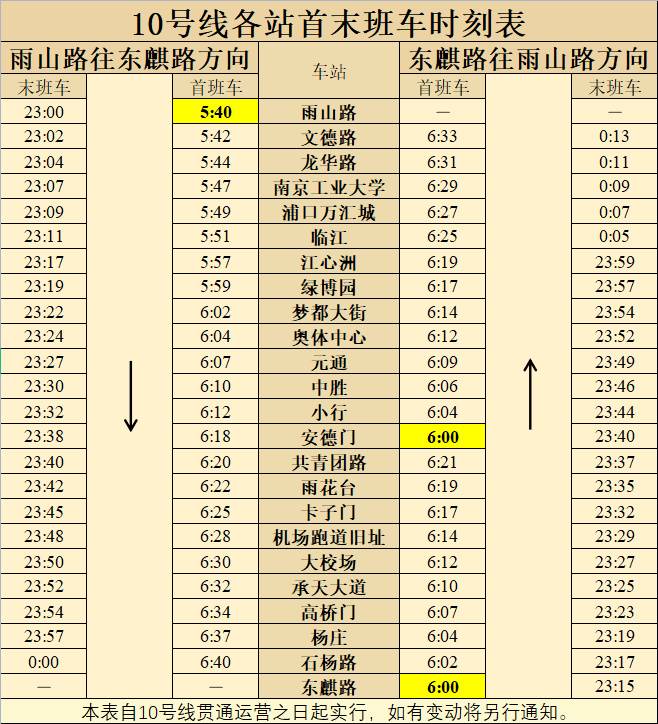10号线全线贯通后,工作日早、晚高峰采用大小交路的行车组织方式,大交路为雨山路至东麒路,小交路为雨山路至大校场;工作日其他时段及周末采用雨山路至东麒路单一交路的行车组织方式。往雨山路方向,东麒路、安德门站设首班车,于6:00同时发出;往东麒路方向,雨山路首班车5:40发出。末班车自雨山路于23:00、自东麒路于23:15发出。
