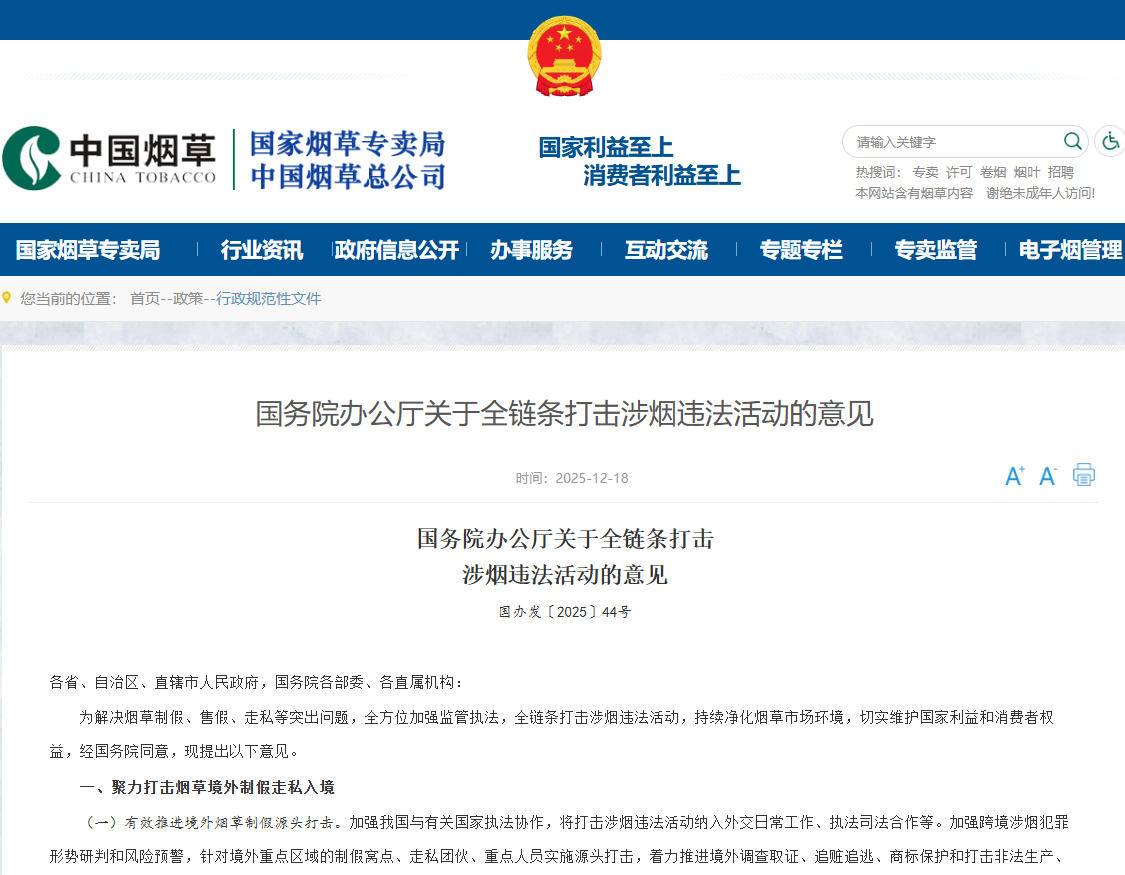 国务院办公厅印发《关于全链条打击涉烟违法活动的意见》 详情