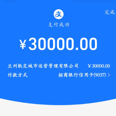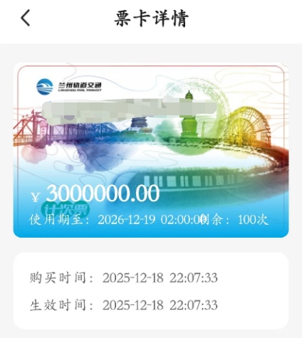 此前,兰州轨道交通发文称,为进一步满足广大市民乘客多样化、便捷化的出行需求,在新年来临之际,推出了限量发行20000张电子计次票的惠民活动。计划从2025年12月18日至21日每日发行5000张,电子计次票单张售价300元、不限里程可乘坐100次。不过,在18日晚10点开始发售时出现了意外。“不是说300元,买完发现居然是3万!”当天晚上10点10分,有兰州网友发文称,自己当时没注意,就这么用信用卡支付了!在发文的同时,该网友还“晒”出了支付成功的截图。记者注意到,收款方为“兰州轨交城市运营管理有限公司”。