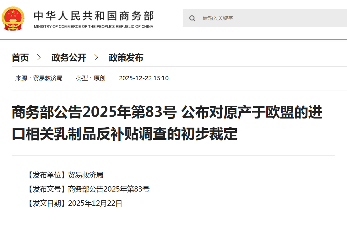 商务部:对原产于欧盟的进口相关乳制品实施临时反补贴措施 详情