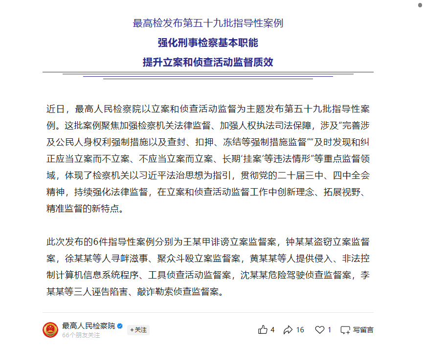 经2025年11月10日最高人民检察院第十四届检察委员会第六十二次会议决定,现将“王某甲诽谤立案监督案”等六件案例(检例第238-243号)作为第五十九批指导性案例(立案和侦查活动监督主题)发布,供参照适用。