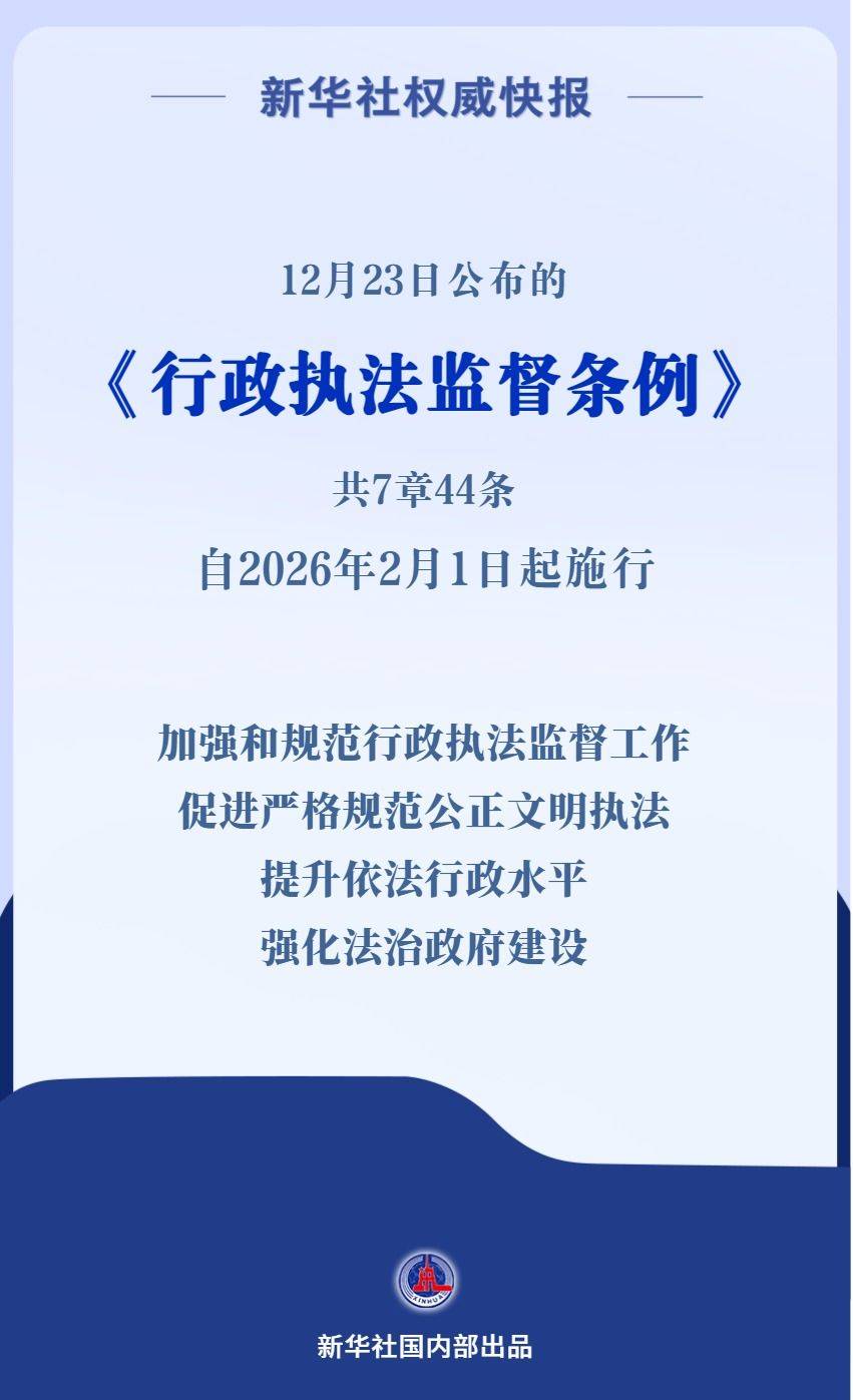 12月23日公布的《行政执法监督条例》自2026年2月1日起施行。