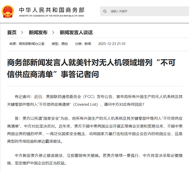 商务部新闻发言人就美针对无人机领域增列“不可信供应商清单”事答记者问