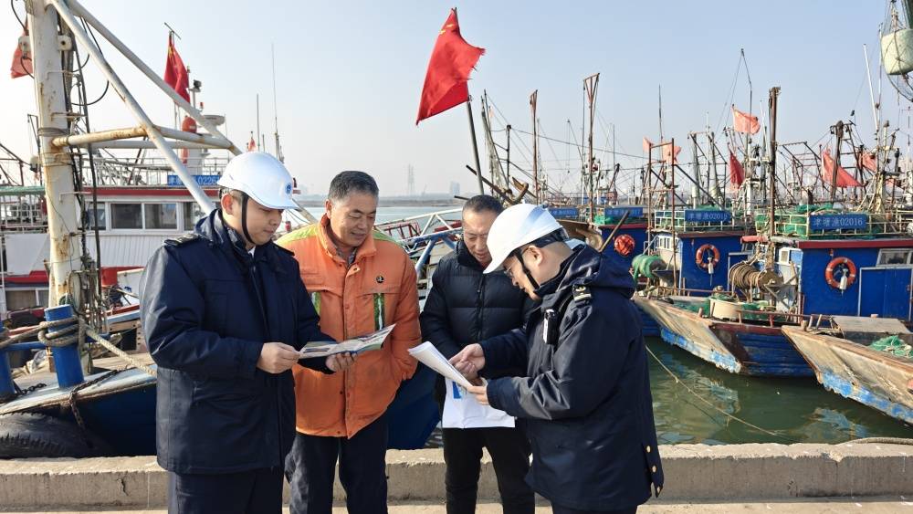 近日,海事执法人员正在向出入渤海湾中部水域的商船、渔船负责人讲解定线制相关规定。